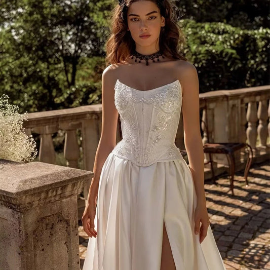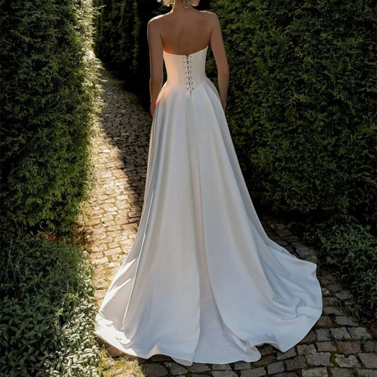 A-Line Strapless Lace Up Back Satin Wedding Dress