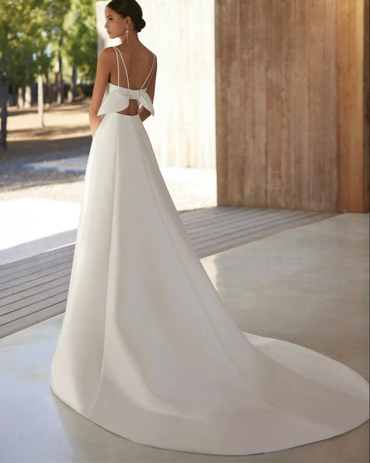Spaghetti Straps Bow Backless Satin Wedding Dress