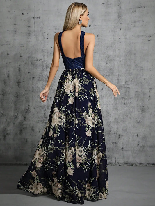 Navy Floral Print Chiffon Sequin Waist Party Dress