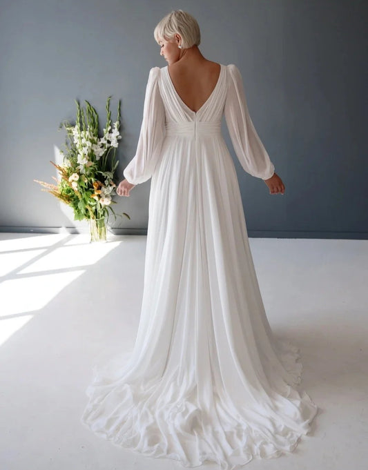 Chiffon A-Line Plus Size V-Neck Puff Sleeve Wedding Dress