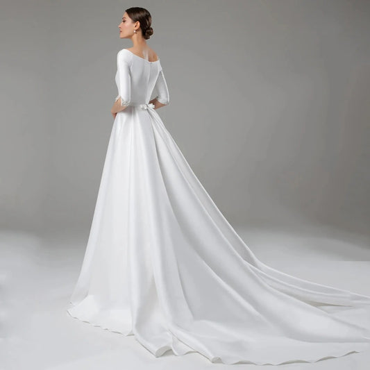 Beaded Neckline Half Sleeves Satin A Line Wedding Dress