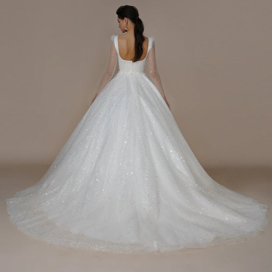 Ivory Beaded Glitter Long Sleeves Princess Wedding Dress