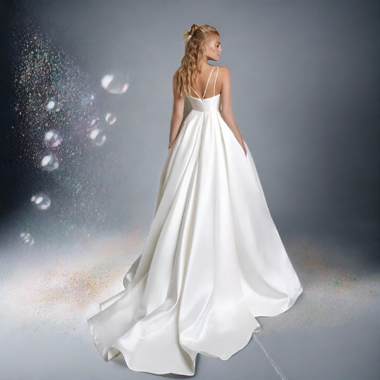 Simple A-Line Satin V-Neck Spaghetti Straps Wedding Dress