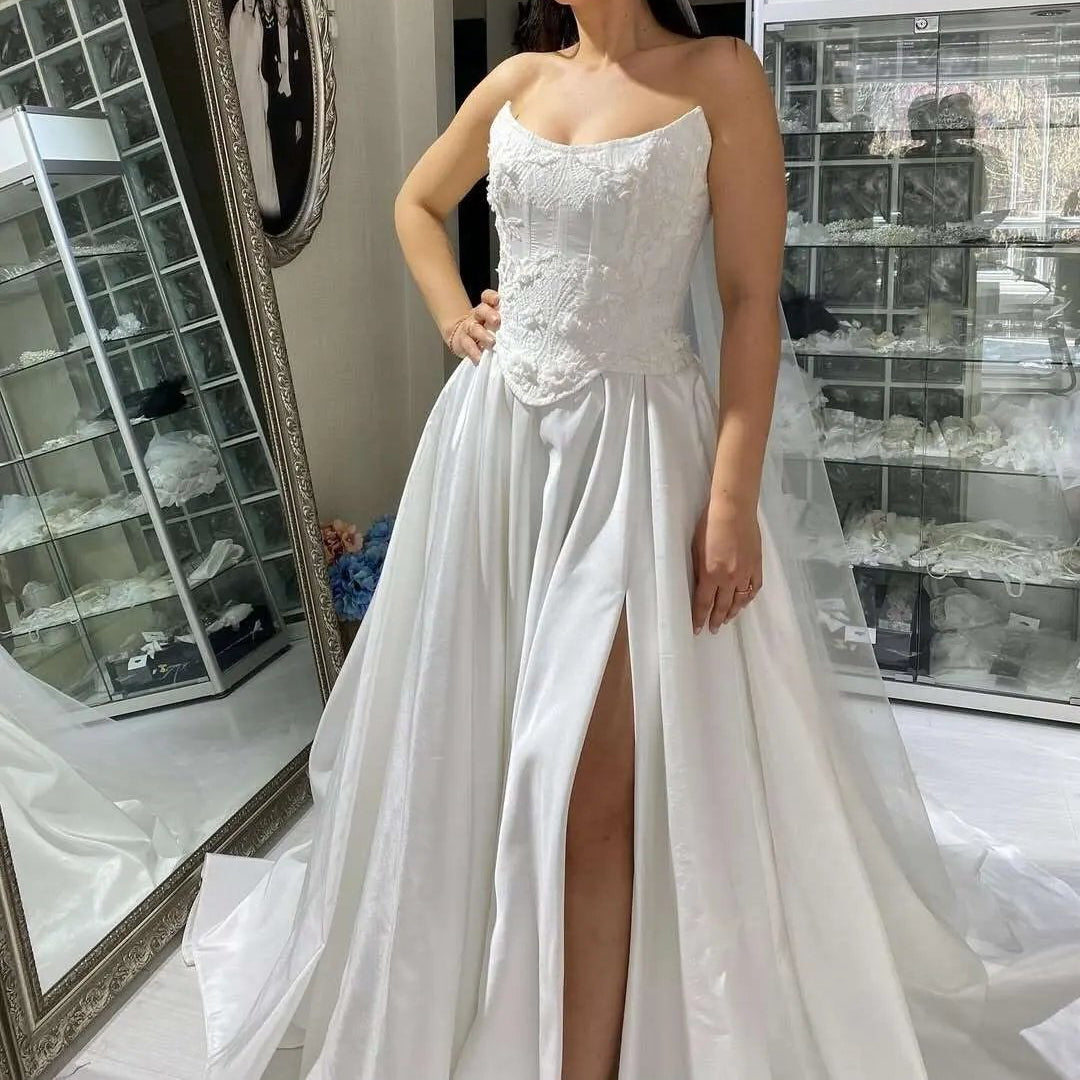 This custom A-line bridal dress combines elegance and modern design with its strapless satin silhouette and structured bodice featuring boning for a flattering fit. Delicate beading, applique lace, and pleating embellishments add intricate detail, while the gathered dropped waist flows into a full skirt with a stylish front leg split and convenient side pockets. Finished with a sweep brush train, built-in bra, and your choice of zipper or lace-up closure, this floor-length gown offers both comfort and sophistication. Crafted from polyester satin with lining, it’s available in custom sizes to perfectly suit your special day. Standard Sizes AU 2-26W.