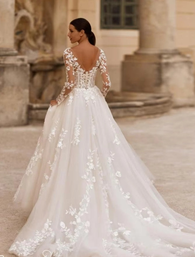 Feel like a fairytale princess in our Beautiful Illusion Lace Long Sleeves Wedding Dress! With its A-line silhouette, open lace-up back, and delicate applique and pearl details, this dress combines classic elegance with modern romance. The illusion scoop neckline and long sleeves add a touch of modesty, while the sweep train and floor-length tulle fabric create a stunning silhouette. Available in a variety of colors and sizes, this dress is sure to make you feel beautiful on your special day.