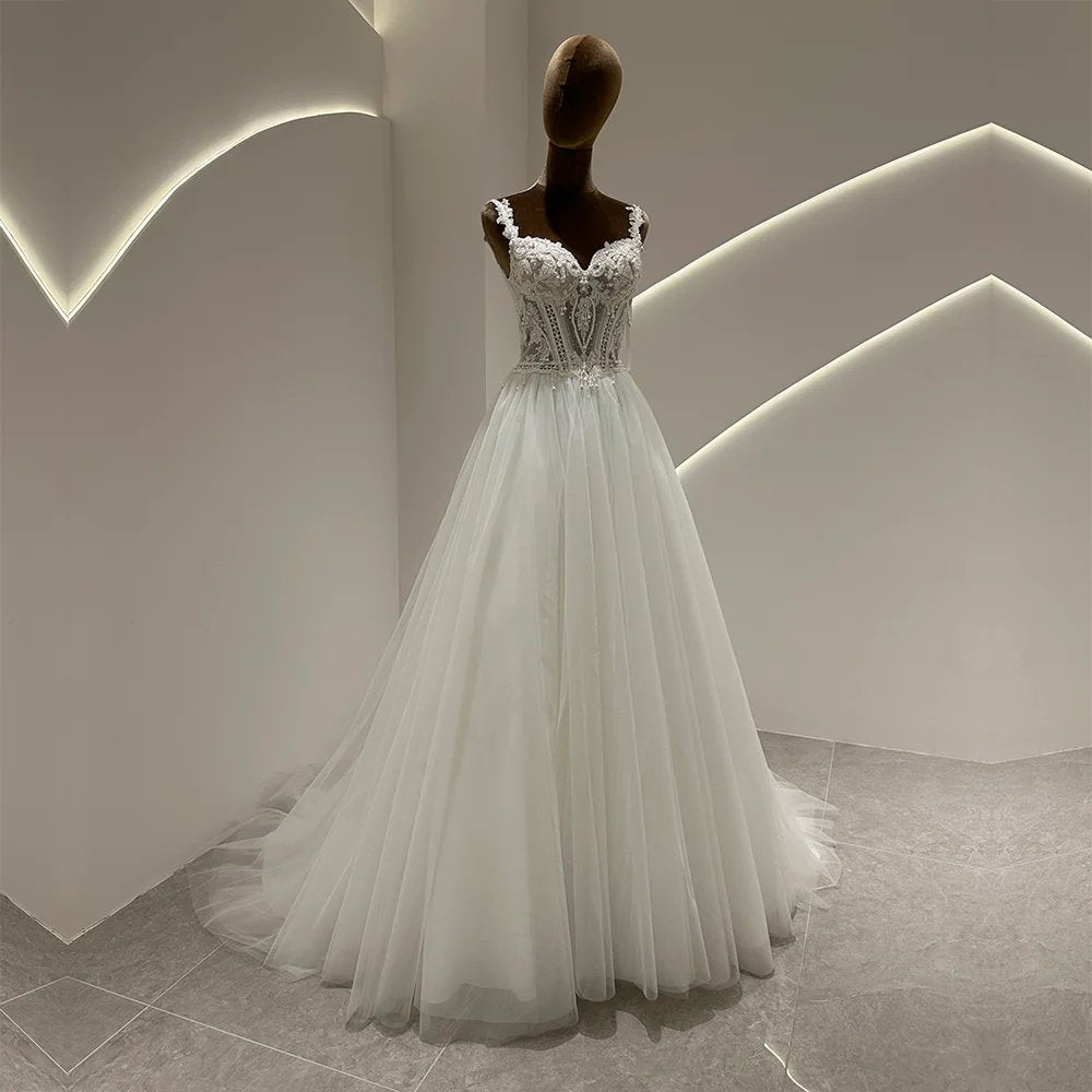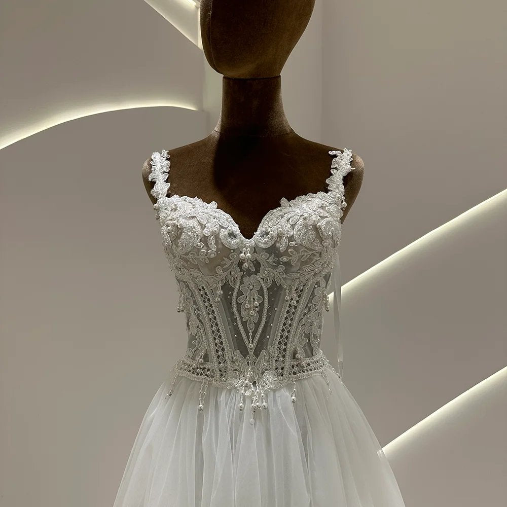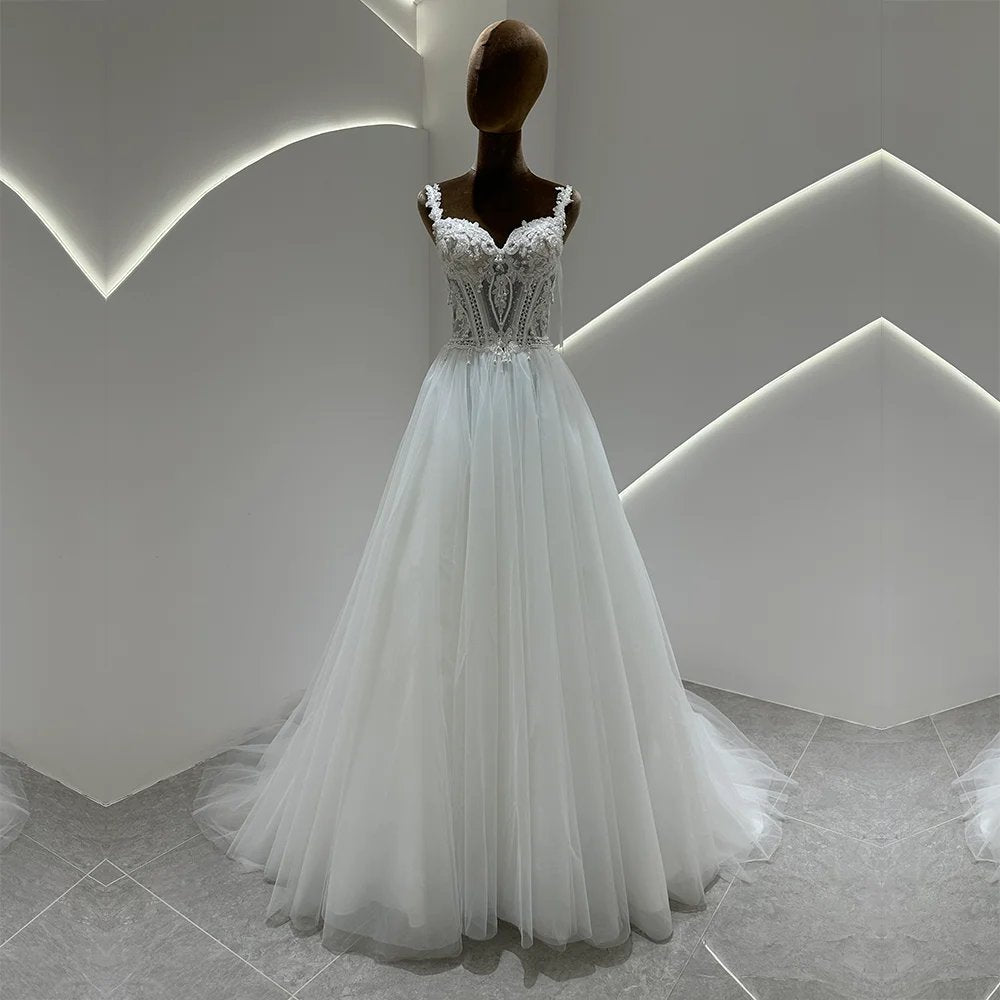 This Boho Beach Bride A-Line wedding dress features a flattering sweetheart neckline and delicate spaghetti straps, perfect for a modern bride seeking effortless elegance. Crafted from lace with intricate appliques, beading, crystals, flowers, pearls, and sequins, it offers exquisite detailing. The built-in bra and corset provide support and shape, while the natural waistline and floor-length A-line silhouette create a graceful flow. Finished with a court train and a convenient zipper back, this ivory gown is available in standard, plus, or custom sizes to ensure the perfect fit for your special day. Size Chart