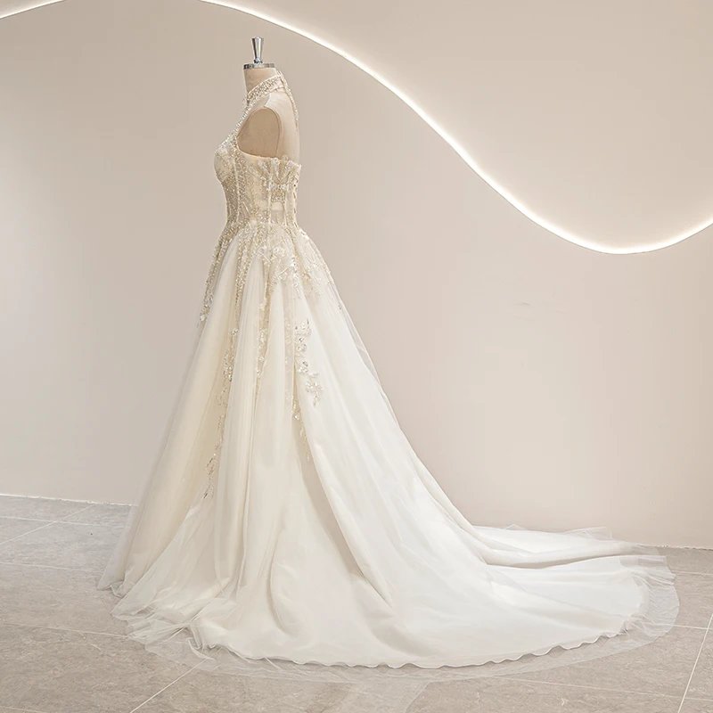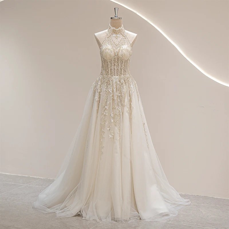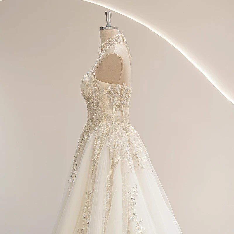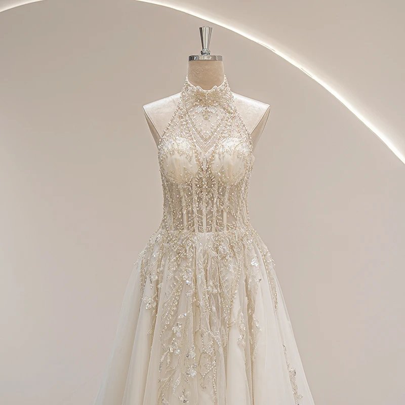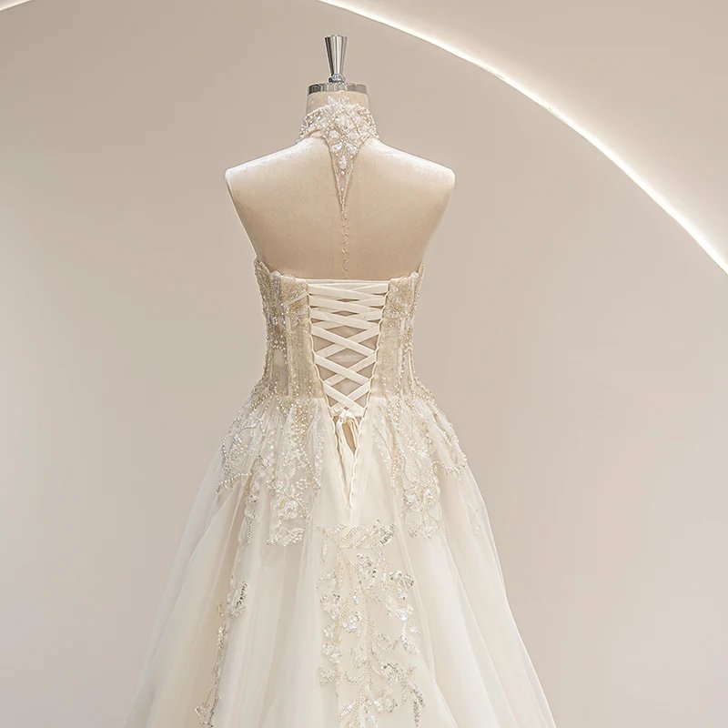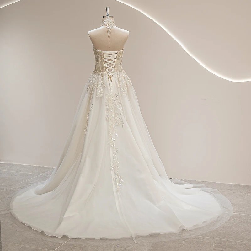 This halter neckline wedding gown in ivory combines vintage charm with modern elegance. Crafted from organza and tulle, it features delicate appliques, beading, crystals, flowers, and lace that enhance its illusion design. The lace-up back, built-in bra, and corset provide a flattering fit, while the natural waistline and court train create a graceful silhouette perfect for beach weddings. Available in standard, plus, or custom sizes, this gown offers both comfort and style for the 2024 bride seeking timeless sophistication. Size Chart