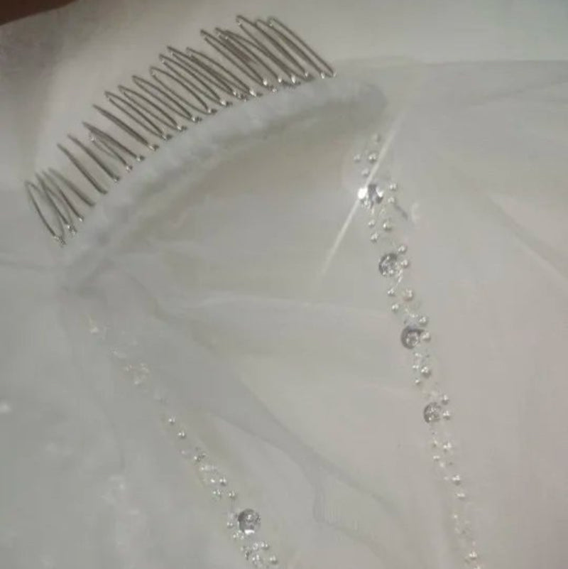 Elevate your wedding day look with this Long Cathedral Pearl Beaded Bridal Veil. Featuring a single-tier design with delicate beaded edges sparkling with pearls and sequins, it adds a touch of fairy-tale glamour as you glide down the aisle. Soft and lightweight, this cathedral-length veil creates a stunning silhouette without weighing you down—perfect for capturing unforgettable moments in effortless style. All sizes are available.