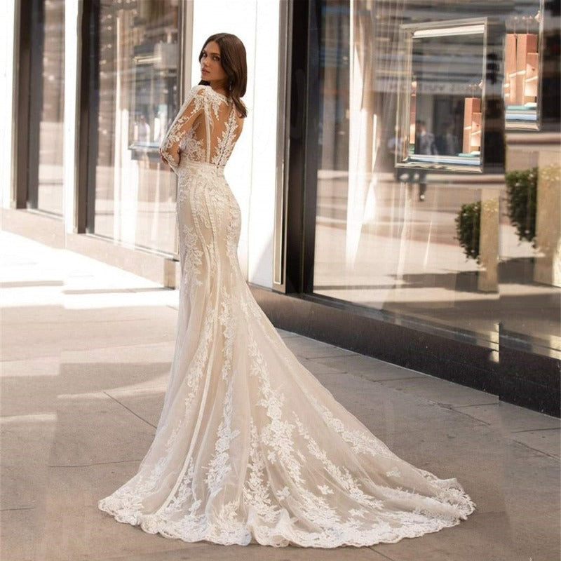 This Modern Lace Mermaid Wedding Dress WD4006 is made of exquisite lace, creating a timeless figure-flattering silhouette. It features a V-neck, long sleeve, discreet panelling, and a floor length sweep train. The illusion back adds a romantic touch to the design. Make a statement with this classic look on your big day. Dress shown is ivory lace over champagne colour lining.